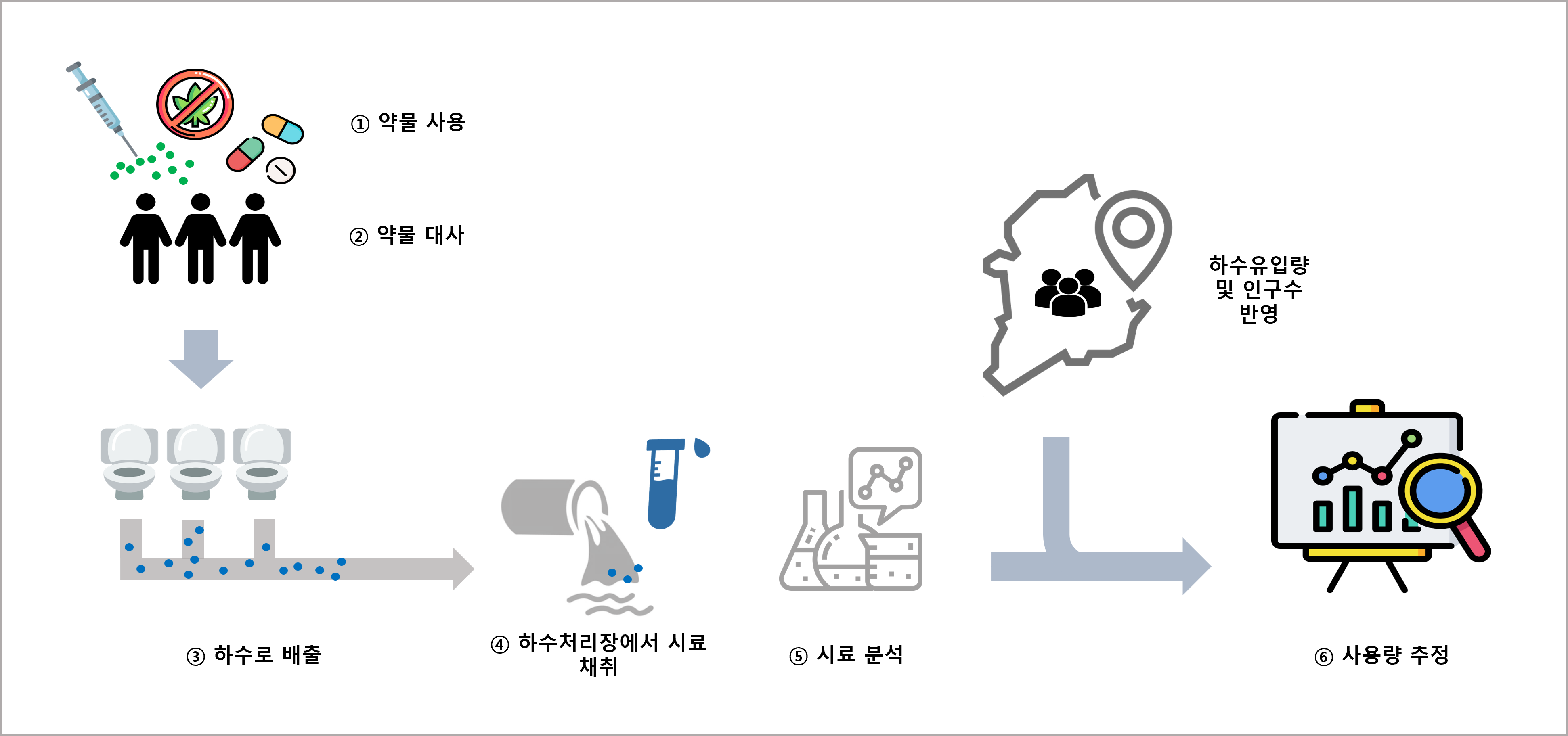 - 하수기반 역학을 이용한 마약류 사용 추정량은 마약류를 섭취한 후 체내 대사 과정을 거쳐 인체 밖으로 배출된 마약류 모물질과 대사 물질을 하수처리장 하수 시료에서 검출‧분석하고 하수 유량과 하수 차집지역 내 인구수, 인체 대사율을 고려하여 추산합니다.